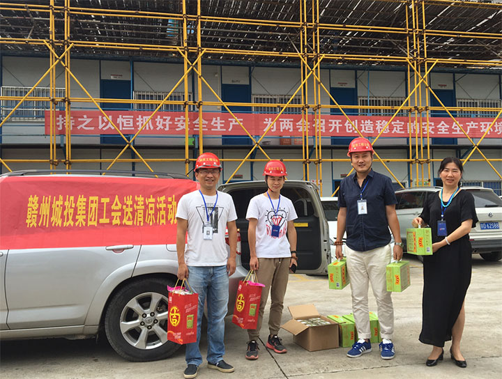 盛夏酷暑,驕陽似火。7月16日至7月23日,贛州城投集團(tuán)工會認(rèn)真貫徹落實集團(tuán)黨委的指示精神,心系項目一線的廣大干部員工,積極開展“夏季送清涼”活動,認(rèn)真做好防暑降溫工作,用實際行動踐行黨的十九大精神,聯(lián)系關(guān)愛干部員工,發(fā)揮橋梁紐帶作用。集團(tuán)工會主席、總經(jīng)理助理肖暉帶隊走訪慰問。
